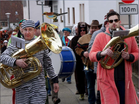 Umzug und Narrenbaumstellen - 04. Februar Am 4. Februar hatte der Michelbacher Fasentverein die “Schäger” wieder dazu eingeladen, das närrische Treiben in unserem Dorf zu eröffnen. Unsere Kapelle führte den Michelbacher Umzug mit fast 30 Gruppen auf der neuen Route durch die Siedlungsstraße bis zur Wiesentalhalle. Dort wurde mit dem Badner Lied der Narrenbaum gestellt und zum ersten mal in diesem Jahr “Fasent in Michelbach” angestimmt. Weitere Bilder in der Galerie.